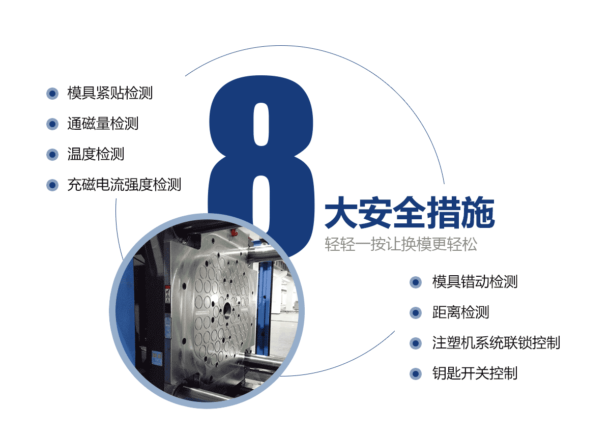 • 電永磁磁力模板只需一名操作員,無需其他工具,就可以在距注塑機(jī)安全距離的磁力系統(tǒng)上執(zhí)行操作。 大大降低人工成本和勞動(dòng)強(qiáng)度。
